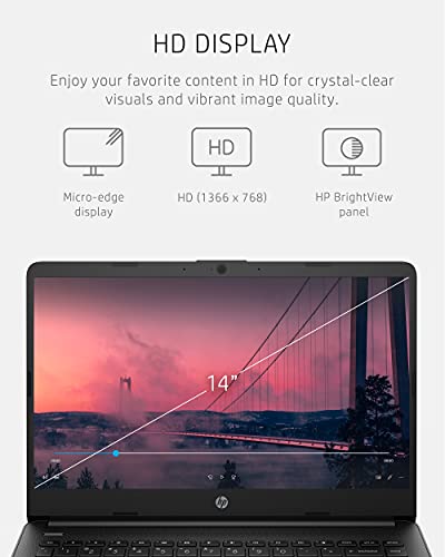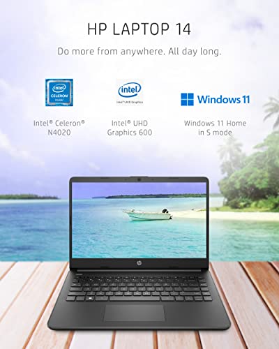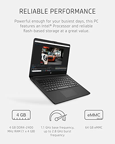 The Jet Black HP 14 Laptop is designed to keep you productive and entertained from anywhere. Maximize your viewing area and see every detail thanks to 6.5 mm micro-edge bezel display, 79% screen-to-body ratio, and 14-inch HD (1366 x 768) display (1) (2). Performance, power consumption, and value come together in the Intel® Celeron® N4020, the ideal processor for your busiest days (3). Enjoy the highest resolution games and movies with the 4K-ready Intel® UHD Graphics 600 (4) (5). Store more of what you love and multitask faster, even with multiple windows open, with this HP laptop’s 64 GB of eMMC storage and 4 GB of RAM (6). Up your creativity and efficiency as this HP 14-inch laptop offers even more features for computing from anywhere. Spend more time focused on your daily tasks and less on the battery life with up to 11 hours and 30 minutes of power (7). Plus, HP Fast Charge keeps you powered especially if you need recharge quickly (8). The exceedingly secure Windows 10 Home in S mode outfits your PC laptop with fast boot times, increased responsiveness, and added protection against phishing and malware (9). Work confidently with 1-year limited hardware warranty and stay connected with the dependable Wi-Fi 5 (1x1) and Bluetooth® 4.2 combo (10) (11). Boost your creativity as your Windows laptop comes with a 1-year subscription to Microsoft 365, including the whole Office Suite: Word, Excel, and PowerPoint (12). Productivity and entertainment features aren’t the only things your device is equipped with; lead a sustainable lifestyle with a thin laptop that is ENERGY STAR® certified and EPEAT® Silver registered (13) (14). (1) Percent of the active plus inactive viewing area to active viewing area plus border. Measure with lid vertical to the desk. (2) High-definition (HD) content is required to view high-definition images. (3) Multi-core is designed to improve the performance of certain software products. Not all customers or software applications will necessarily benefit from the use of this technology. Performance and clock frequency will vary depending on application workload and your hardware and software configurations. Intel’s numbering, branding, and/or naming is not a measurement of higher performance. Intel, Pentium, Intel Core, Celeron, Iris Xe, Intel logo, and the Intel Inside logo are trademarks of Intel Corporation in the U.S. and other countries. (4) Wireless access point and internet service required and sold separately. The availability of public wireless access points is limited. (5) Graphics output may be limited based on the maximum resolution of the display. Shared video memory (UMA) uses part of the total system memory for video performance. System memory dedicated to video performance is not available for other use by other programs. (6) For storage drives, GB = 1 billion bytes. The actual formatted capacity is less. Up to 5.1GB of disk is reserved for system recovery software. (7) Battery life tested by HP using continuous FHD video playback, 1080p (1920x1080) resolution, 150 nits brightness, system audio level at 17%, player audio level at 100%, played full-screen from local storage, headphone attached, wireless on but not connected. Actual battery life will vary depending on configuration and maximum capacity will naturally decrease with time and usage. (8) Features may require software or other 3rd party applications to provide the described functionality. Internet service required and not included. (9) Not all features are available in all editions or versions of Windows. Systems may require upgraded and/or separately purchased hardware, drivers, software, or BIOS update to take full advantage of Windows functionality. Windows 10 is automatically updated, which is always enabled. ISP fees may apply and additional requirements may apply over time for updates. See microsoft.com. Windows 10 Home (S mode) works exclusively with apps from the Microsoft Store within Windows. Certain default settings, features, and apps cannot be changed. Some accessories and apps compatible with Windows 10 may not work (including some antivirus, PDF Writers, driver utilities, and accessibility apps) and performance may vary, even if you switch to Windows 10 Home configuration (fee may apply). You can’t switch back to Windows 10 Home (S mode). Learn more at Windows.com/Windows10SFAQ. (10) Wireless access point and internet service required and sold separately. The availability of public wireless access points is limited. Wi-Fi 5 (802.11ac) is backward compatible with prior Wi-Fi 5 specs. (11) Bluetooth® is a trademark owned by its proprietor and used by Hewlett-Packard Company under license. (12) Microsoft 365 Personal 1-year subscription included. Activation is required within 6-months of the Windows activation date. Microsoft 365 Family and Microsoft 365 Personal have non-commercial rights and are meant for personal use only. See microsoft.com for full details. (13) ENERGY STAR and the ENERGY STAR mark are registered trademarks owned by the U.S. Environmental Protection Agency. (14) Based on U.S. EPEAT® registration according to IEEE 1680.1-2018 EPEAT®. EPEAT® status varies by country. Visit www.epeat.net for more information.